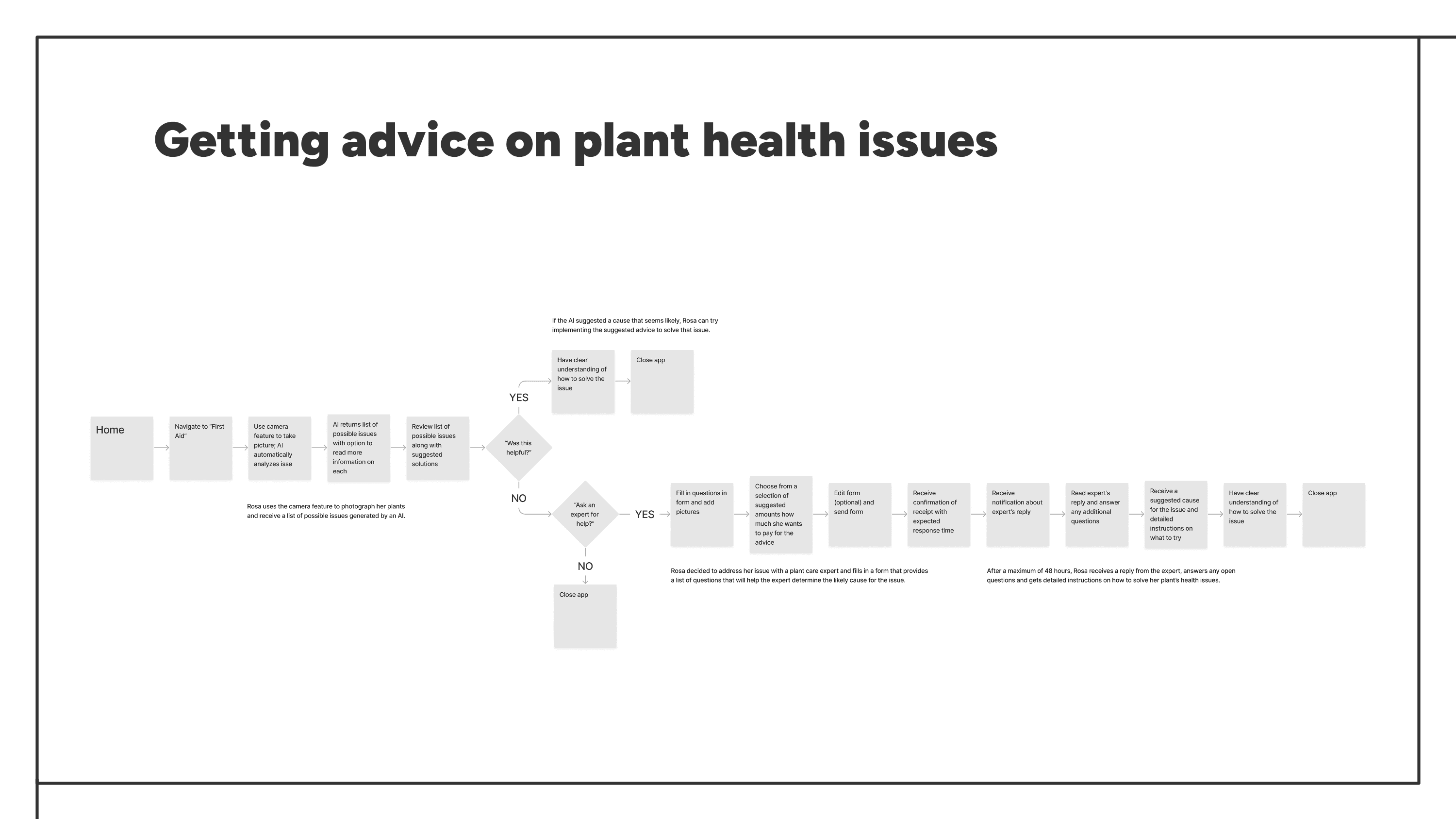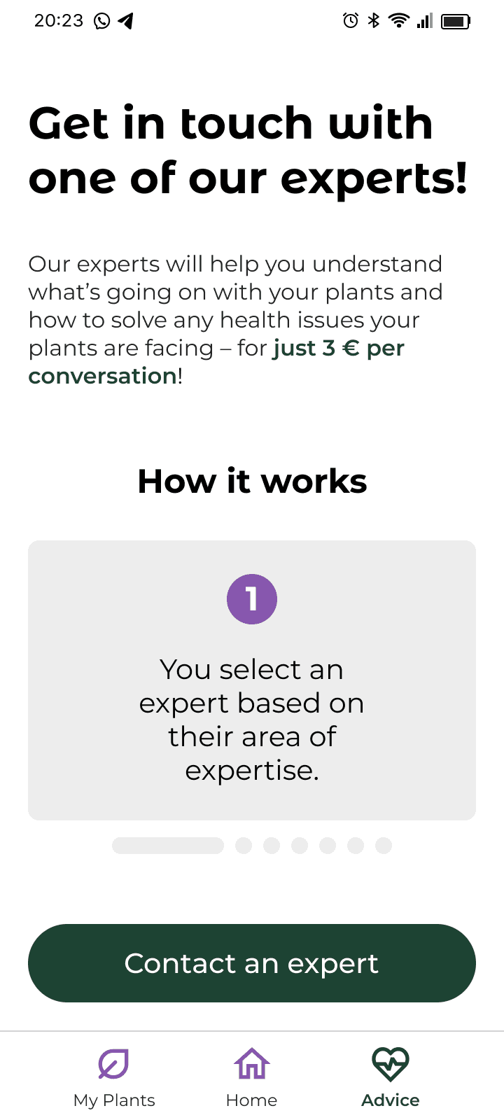 During usability testing, users expressed the need for a confirmation screen to verify the identified plant before adding it to their collection. I also added a carousel explaining how to contact an expert, boosting user confidence in starting the chat.